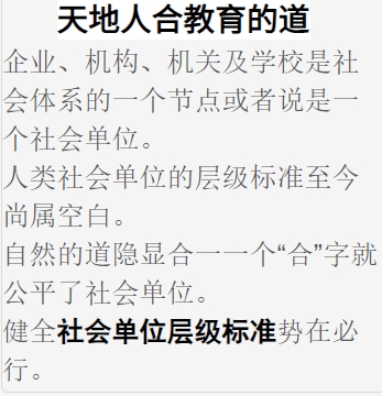 人类世界的企业、机构、机关及学校等社会体系节点或社会单位,其层级标准尚存空白。制定人类社会单位标准,是定为社会基本元素的标尺,该标尺包括无病、长寿、富足、爱天、守法等要素。达到此标准,则个人及社会单位将能够存活。