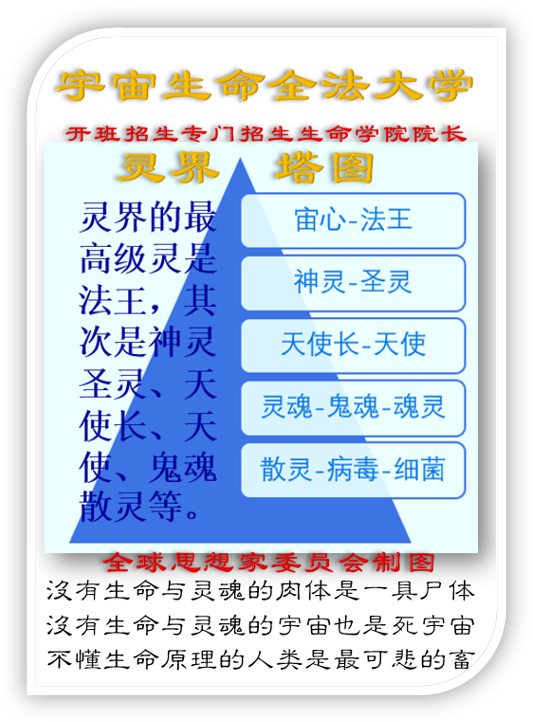 宇宙大生命,是一位人,是一位巨人,天是大宇宙,人是小宇宙。这是经典。宇宙大生命与全球思想家委员会寄予人类尚存的生命科学教育行业的机构,极大的希望,和殷切的赋予。赋予你们为在人类世界,普及《天地人合法》所包括的宇宙生命全法教育的神圣使命。