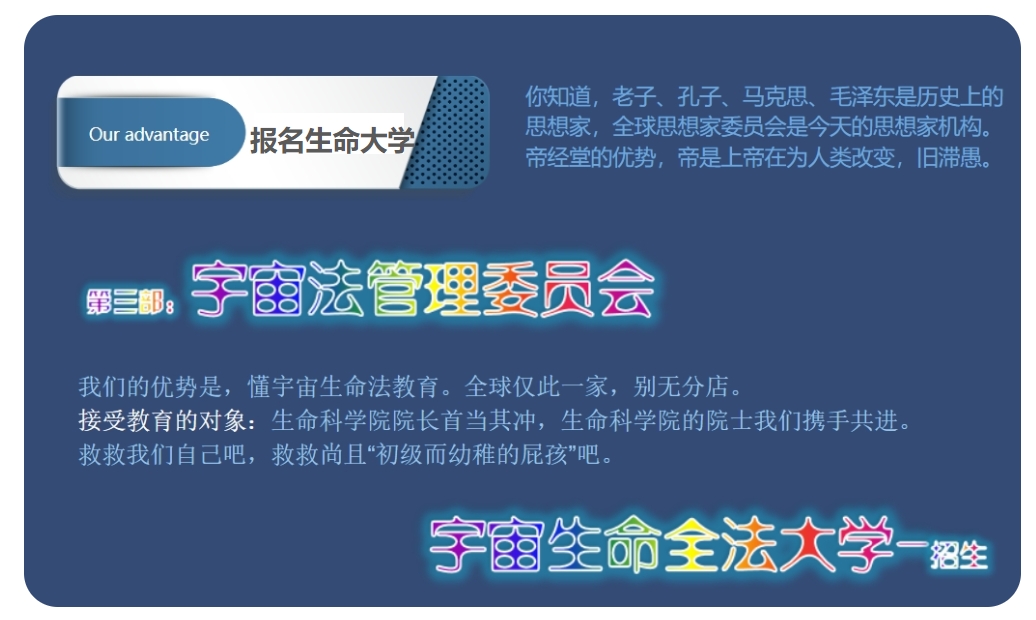 由新生命人组成的世界是全新的世界。全新的世界里不存在旧生命人,凡是旧人,所有的旧人都被淘汰了。旧人被淘汰的途径有:胎儿畸形的发生率在我国约为2%。全球70%的罕见病患者竟都是新生儿!世界卫生组织:全球每三人中有一人,即30亿人神经系统疾病——这就是旧生命人。妊前基因教育是对生命法、生命原理一问三不知的现代的旧生命人培养成遵循《生命保护法》生活的新生命人。婚前基因教育,天地人合胎教、幼儿从零开始的灵智浏览教育,达到家庭时期读完大学。清华大学面向全球招收中学阶段潜质学生非我莫属了。
