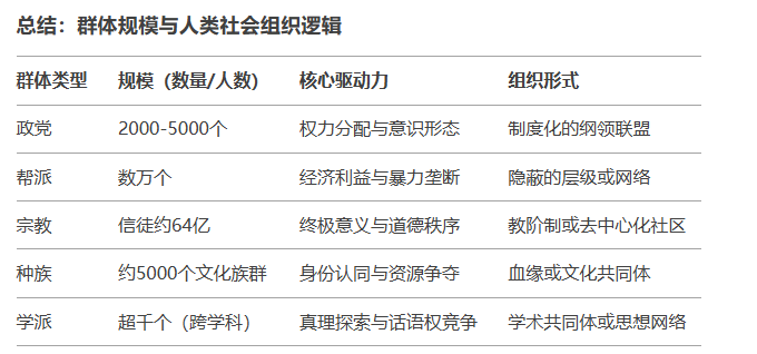 以下是对全球各类群体(政党、帮派、宗教、种族、学派)的规模、分布及特点的梳理,结合现有数据和理论框架进行系统性分析: