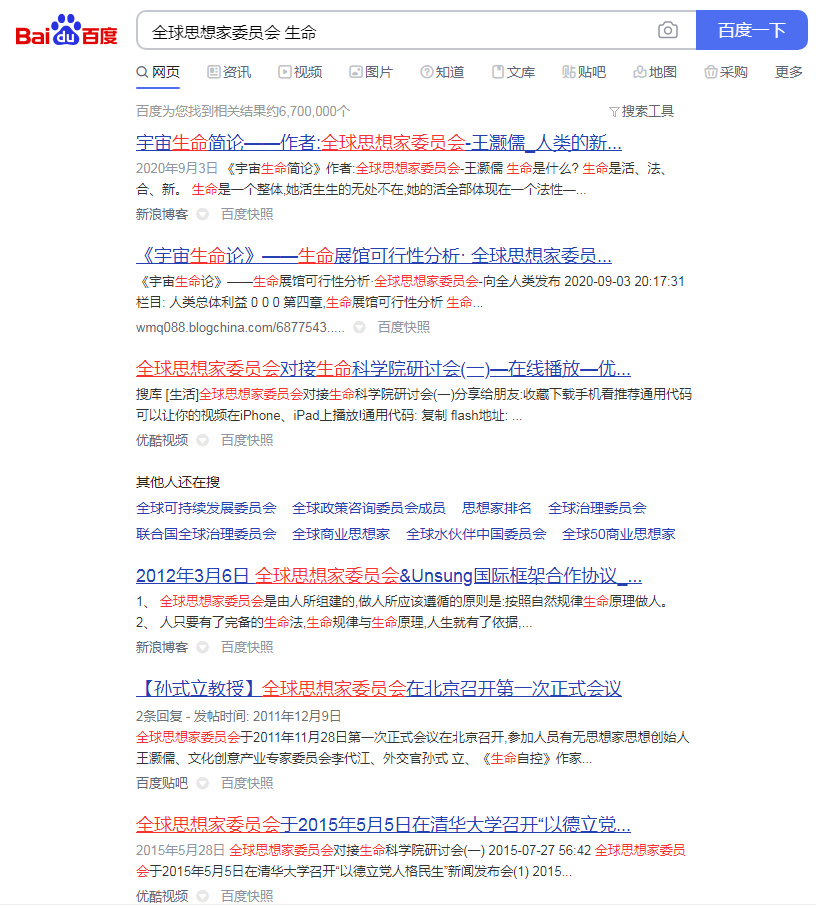 全球4000对家生命科学院,网上找不到一篇《生命论》的论文,而在百度搜索:全球思想家委员会 生命,二字,全球思想家委员会对于生命的研究与发布连篇累牍。