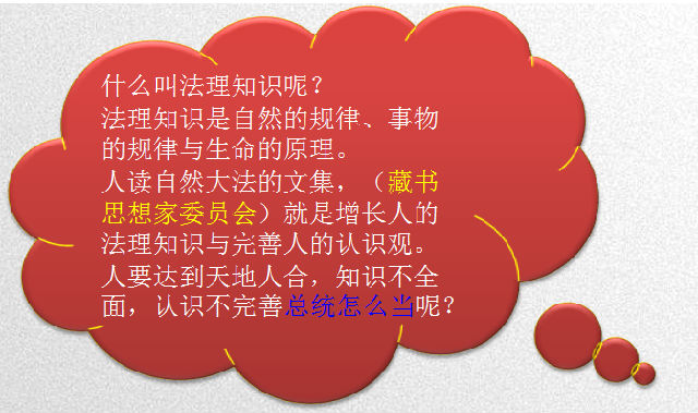 什么叫法理知识呢?《天地人合自然大法》就是法理知识。法理知识是自然的规律、事物的规律与生命的原理。法理知识又是自然规律、事物的规律与生命原理的文字化。人读自然大法的文集,就是增长人的法理知识与完善人的认识观。
