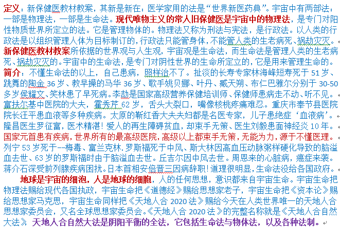 定义:新保健医教材教案,其新是新在:医学家用的法是“世界新医药典”。宇宙中有两部法:一部是物理法,一部是生命法。现代唯物主义的常人旧保健医是宇宙中的物理法,是专门对阳性物质世界所定立的法。它是管理物体的。物理法又称为刑法与宪法,是行政法。以人类的行政法是以组织管理人体为目标制订的,行政法只能管身体,不能管人类的生老病死、祸劫灾灭。