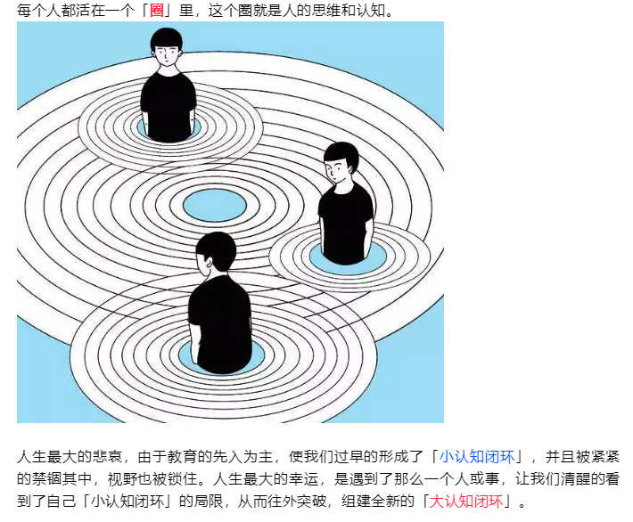 人生最大的悲哀,由于教育的先入为主,使我们过早的形成了「小认知闭环」,并且被紧紧的禁锢其中,视野也被锁住。人生最大的幸运,是遇到了那么一个人或事,让我们清醒的看到了自己「小认知闭环」的局限,从而往外突破,组建全新的「大认知闭环」。