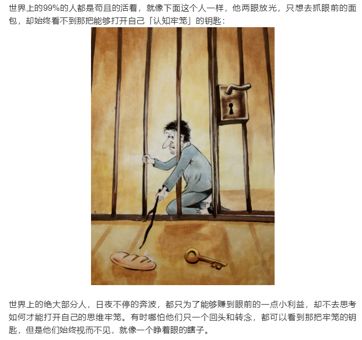 世界上的绝大部分人,日夜不停的奔波,都只为了能够赚到眼前的一点小利益,却不去思考如何才能打开自己的思维牢笼。有时哪怕他们只一个回头和转念,都可以看到那把牢笼的钥匙,但是他们始终视而不见,就像一个睁着眼的瞎子。