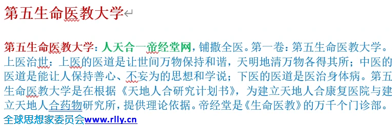 第五生命医教大学:人天合一帝经堂网,铺撒全医。第一卷:第五生命医教大学。上医治世:上医的医道是让世间万物保持和谐,天明地清万物各得其所;中医的医道是能让人保持善心、不妄为的思想和学说;下医的医道是医治身体病。第五生命医教大学是在根据《天地人合研究计划书》,为建立天地人合康复医院与建立天地人合药物研究所,提供理论依据。帝经堂是《生命医教》的万千个门诊部。