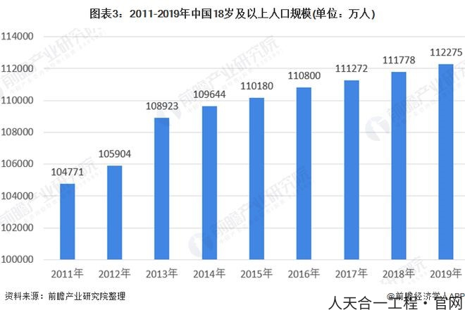 由此,测算出2011-2019年中国18岁及以上人口数量,2011-2019年中国18岁及以上人口数量逐年增加,2019年中国18岁及以上人口数量达到112275万人,相较2018年同比增长0.44%。