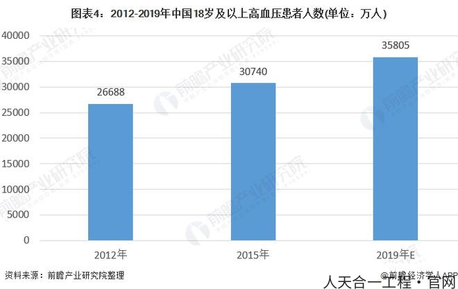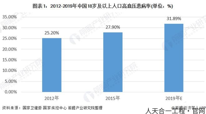 国家关于高血压患病的官方数据,根据部分区域调研数据,按比例算出全国的高血压患病率,目前最新的高血压患病率的官方权威数据是国家卫健委2019年8月发布的《中国高血压防治现状蓝皮书2018》中公布的数据,2012年我国18岁及以上人口的高血压患病率为25.20%,2015年上升至27.90%。由此根据2012-2015年的年均复合增长率,结合国家疾控中心发布的关于高血压的人口年增长数量新闻,预测2019年中国高血压患病率达到31.89%。