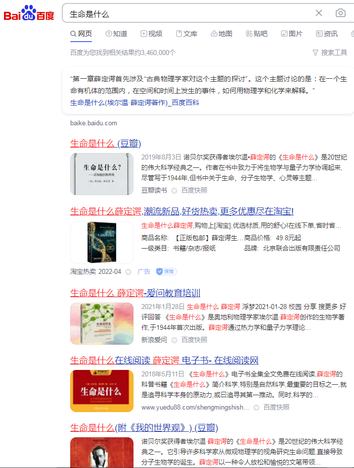 在百度搜索:生命是什么?又回到奥地利物理学家薛定谔那里去了。