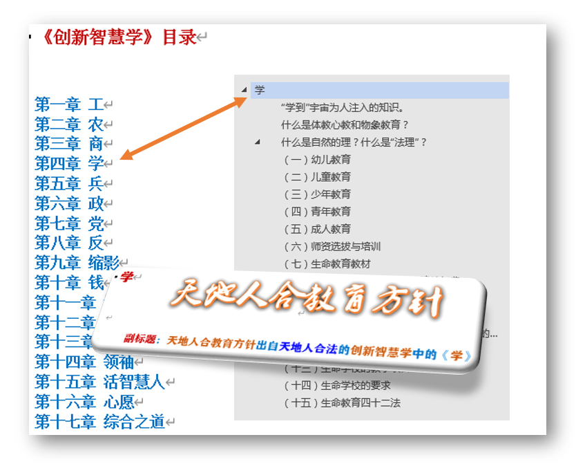 婴幼的两段教育合起来,正好是个宇宙智慧的概模。婴幼的宇宙智慧概模形成,幼儿的智慧就可超越现有的常规人材,奠定创新智慧的基础。