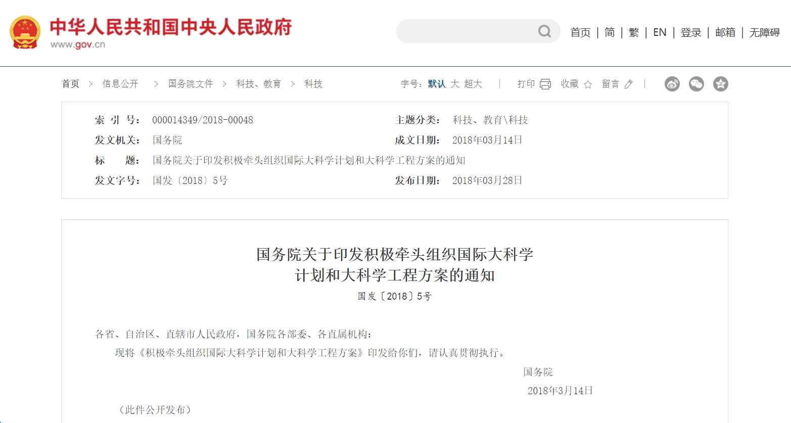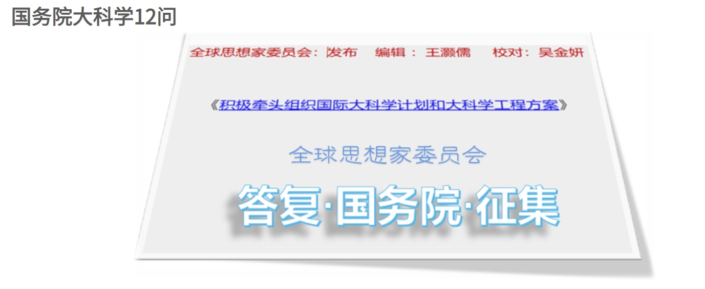 副标题:创建世界大科学研究院承接《积极牵头组织国际大科学计划和大科学工程方案》简称:国务院大科学12问