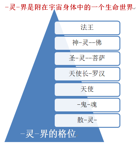 灵界不是宇宙的原本生命界。宇宙的原本生命界统治着众星。宇宙的原本生命如同人的原本生命一样,它支撑着身体的筋肌与百骨,主导着肌体的运动生存。灵界是附在宇宙身体中的一个生命世界,这个生命世界以能量的形式存在,构成这个世界的能量是灵与灵魂和灵气。灵界的灵、灵魂与灵气,都以能量体的形式存在。灵界的最高级灵是法王,其次是神灵、圣灵、天使长、天使、鬼魂、散灵等。人间所说的佛、菩萨、罗汉等,也就是神灵、圣灵、天使长的格位,灵界不包括宇宙的原本生命,即天意、星系、星球的生命与意识。人类的教门中,大部分讲的信的就是宇宙中的这个灵界。