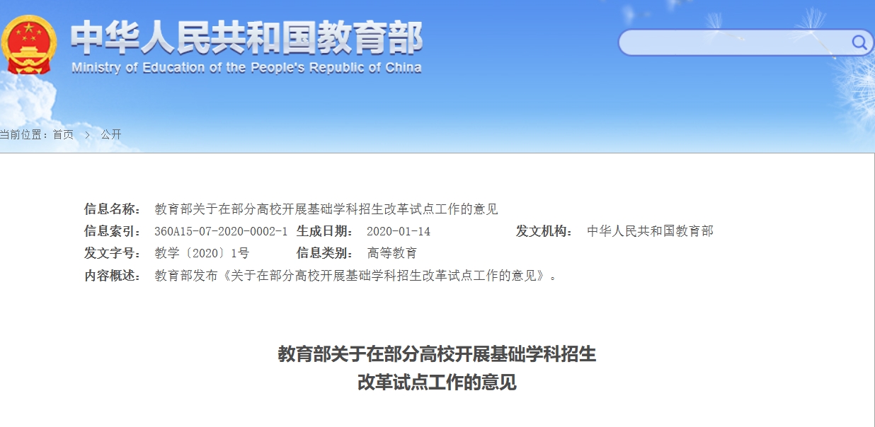 为深入贯彻党的十九大和十九届二中、三中、四中全会精神,落实全国教育大会精神,服务国家重大战略需求,加强拔尖创新人才选拔培养,我部决定自2020年起,在部分高校开展基础学科招生改革试点(也称强基计划)。现就有关工作提出如下意见。