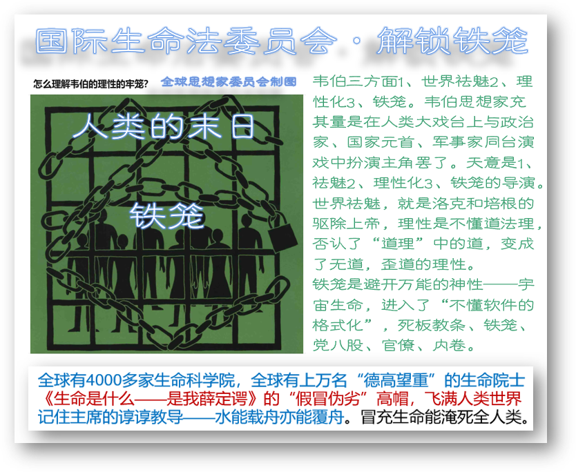 世界祛魅,就是洛克和培根在驱除上帝,理性是不懂道法理,否认了“道理”中的“道”,变成了理性,无道,歪道。铁笼则是避开万能的神性——宇宙生命进入“不懂软件的格式化”,死板教条、铁笼、党八股、官僚、内卷。