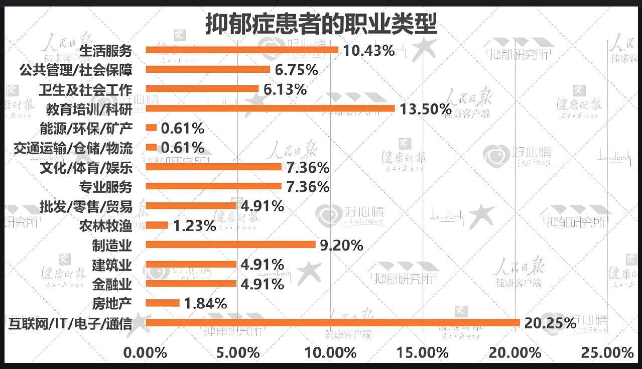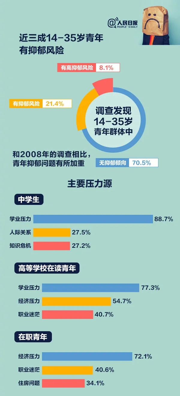 2019年中国精神卫生调查研究报告显示,中国抑郁障碍的终身患病率为6.8%,12个月患病率为3.6%,其中,抑郁症的终身患病率为3.4%,12个月患病率为2.1%。