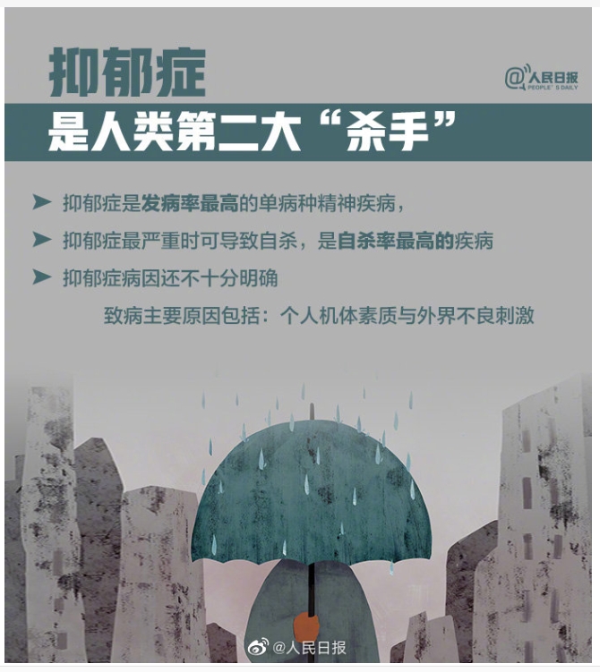 2017年世界卫生组织(WHO)有关全球疾病负担的统计显示,抑郁障碍的伤残调整生命年(从发病到死亡所损失的全部健康寿命年)上升至第11位,研究还显示抑郁障碍已成为导致伤残损失健康生命年(因早死所致的寿命损失年)的第三大原因,预计到2020年,抑郁症将成为仅次于心血管疾病的第二大疾病负担源。