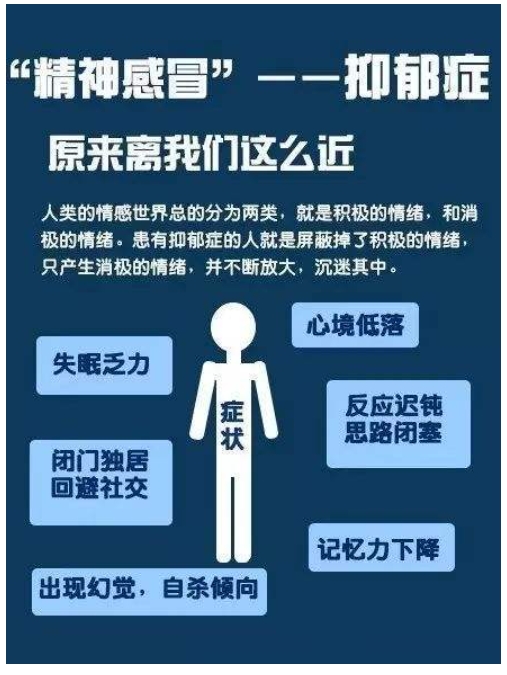 自我感觉到的或是他人可观察到的情绪低沉、苦恼忧伤,觉得痛苦很难熬过去,感觉不到开心,甚者觉得度日如年、生不如死,常常愁眉苦脸、唉声叹气。