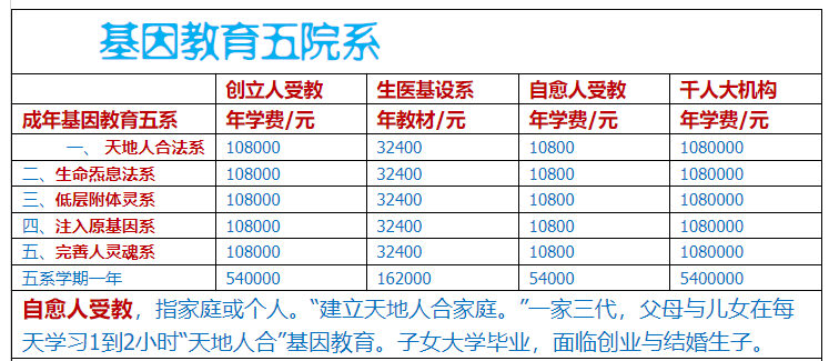 八、家庭原基因系:一家三代基因换种:自愈人受教,指家庭或个人。“建立天地人合家庭。”一家三代,父母与儿女在每天学习1到2小时“天地人合”基因教育。子女大学毕业,面临创业与结婚生子。在几年的家庭教育中,已经为子女灌输了多年的“天地人合”教育,潜移默化的刻进基因无需进修宇宙生命教育学院,全家作为新生命人的梦想圆圆融融实现,病基因遗传病被根绝,终身无病、无犯罪而永生人诞生。