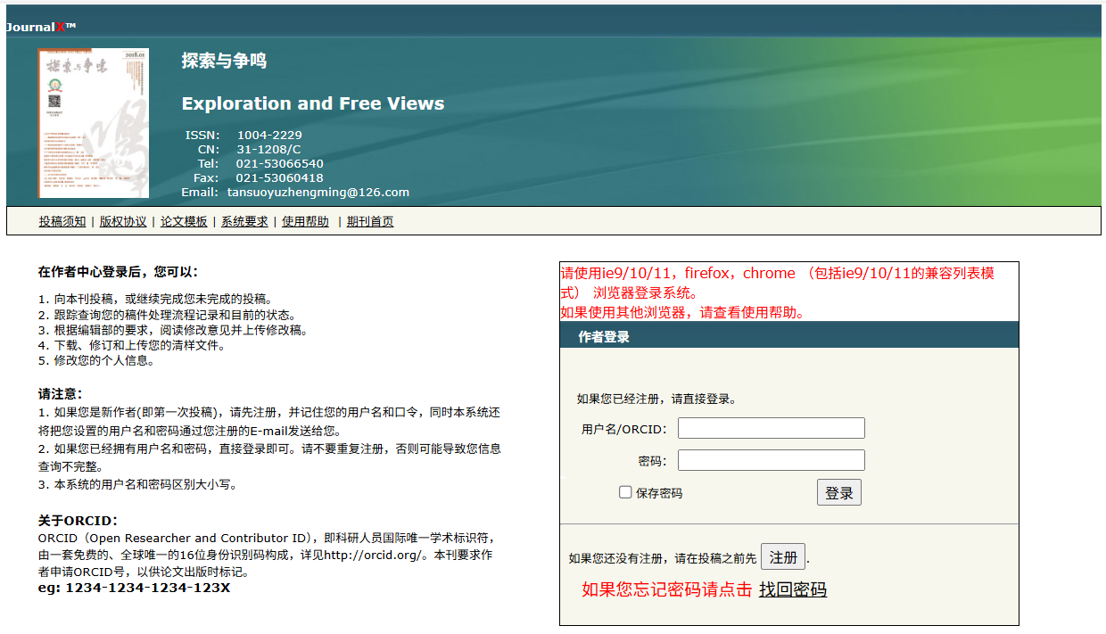 《探索与争鸣》杂志创刊于1985年,是一本沐浴着改革开放春风成长起来的学术期刊,也是国内唯一一本以“学术争鸣”和关注中国重大现实问题为主要特色的综合性理论期刊,系第三届中国出版政府奖提名奖期刊、国家社科基金资助期刊、上海市教育发展基金会重点项目资助期刊,同时入选中文社会科学引文索引(CSSCI)来源期刊、中国人文社会科学核心期刊、全国中文核心期刊,并连续被评为华东地区优秀期刊。 为与国际学术论文发表规范接轨,以适应编排现代化的要求,敬请来稿注意以下事项: 1. 来稿请提供作者的详细信息:姓名、出生年月、性别、民族、学历、职称、研究方向、单位、地址、邮编、电话、电子信箱。 2.来稿字数请控制在12000-15000字左右,合作作者不超过两位。来稿请提供文章的中英文篇名(不超过15字)、内容摘要(300字左右)、关键词(3-5个)。摘要应高度概括、准确反映文章的主要观点和思路。 3.来稿中凡涉及引用中外著作、论文、报刊、网络等信息,请清晰、规范地标示注释。根据国家标准(GB/7714-2015),结合本刊实际,引文注释在正文中用上标“①②……”标示,格式参考《中国社会科学》。 4. 本刊对来稿实行专家匿名审稿和编辑部三审,审稿周期为3个月,自投稿之日起超过3个月如未查询到处理结果,可以另投他刊。 5. 来稿如拟采用,在尊重作者原意的情况下,本刊有权对文章的语言文字、内容结构按编辑规范进行删改,不同意删改者请事先声明。 6. 本刊杜绝一稿多投,更反对抄袭之作,凡由此而引发的所有后果一律由作者本人承担。 7. 凡向本刊投稿,如未注明非专有许可,将视为专有许可,本刊对所刊登的稿件拥有专有使用权。 8. 稿件一经采用,即付稿酬并寄送样刊。作者著作权使用费(含数字化使用)包含在稿费之中,一次性付清。 9. 本刊不以任何形式收取版面费(举报电话:010-63094651)。 注:自2018年6月1日起,本刊只接受《探索与争鸣》网站投稿。请收藏唯一真实官网地址www.tsyzm.com。原编务邮箱tsyzm@sssa.org.cn停止使用,原投稿邮箱tansuoyuzhengming@126.com为编务邮箱和应急邮箱。 我刊已与《中国学术期刊(光盘版)》电子杂志社有限公司签署独家代理协议。自2020年1月1日起,《探索与争鸣》刊发的文章将全文被《中国学术期刊网络出版总库》等CNKI系列数据库产品独家收录。凡在本刊发表的作品如无特殊声明,视为作者已同意将其作品著作权的专有许可使用权和独家代理权授予本刊编辑部,由编辑部统一纳入以上期刊网和数据库,有不同意者,请另投他刊或特别声明。本刊不承担文章来源的合法性责任。作者著作权使用费(含数字化使用)包含在稿费之中,一次性付清。