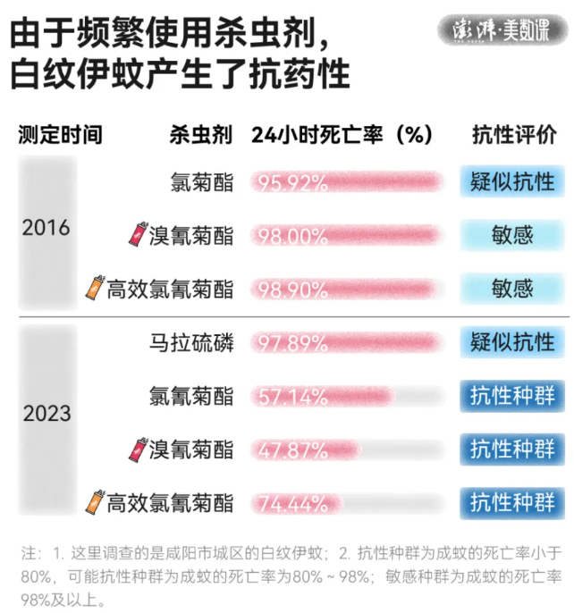 咸阳市疾病预防控制中心曾在2016年和2023年两次调查当地白纹伊蚊对常用杀虫剂的抗药性,相比第一次调查时蚊子对3类菊酯类杀虫剂均呈现低水平抗性,7年后再调查时,蚊子对其中2类杀虫剂已发展为高水平抗性。研究者认为,这种变化主要因为“频繁使用卫生杀虫剂”和“不规范使用杀虫剂”。