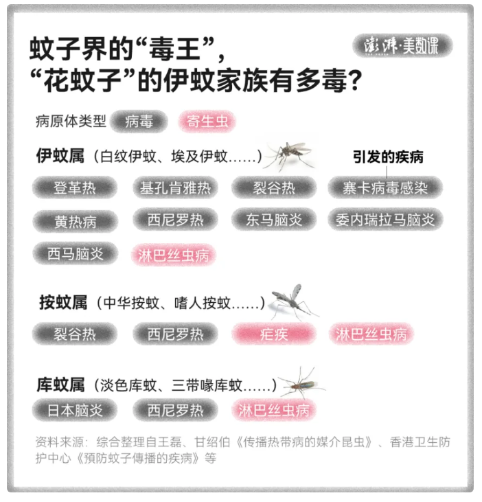 相比淡色库蚊的蚊媒病主要是西尼罗热、日本脑炎等,白纹伊蚊携带的病原体就要多得多:从登革热、黄热病、寨卡病毒感染这样的黄病毒属疾病,到基孔肯雅热、裂谷热这样的甲病毒属疾病,覆盖了出血热、神经系统疾病和发热综合征等多种类型。
