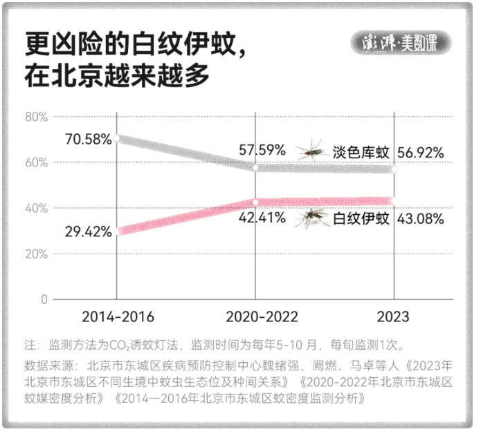 这不是错觉,北京市东城区疾病预防控制中心的魏绪强等人在监测了近十年的蚊虫密度后发现,在东城区的蚊子中,白纹伊蚊的种群构成比例在不断上升——相比2014年时的不到30%,2023年已上升到了43.08%,已有追上北京“土著”淡色库蚊的趋势。