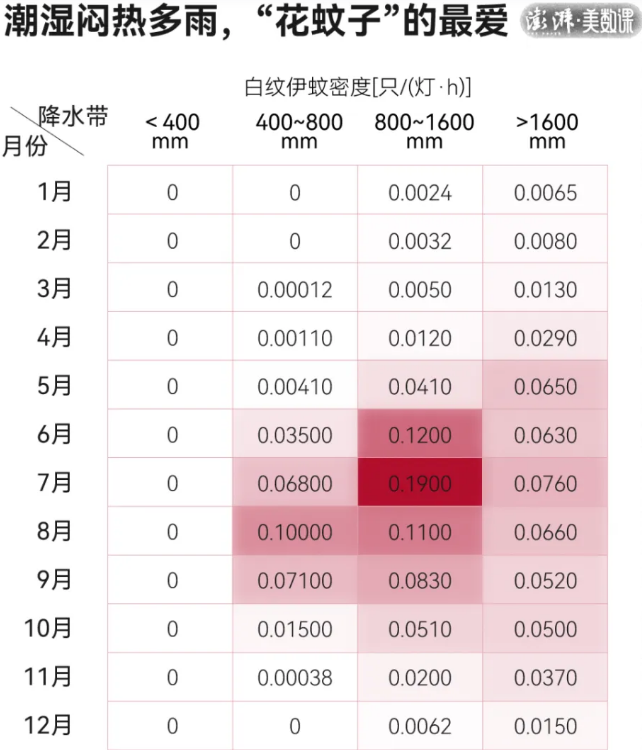 中国疾病预防控制中心传染病预防控制所吴海霞等人基于2006-2013年国内19省的白纹伊蚊监测数据分析后发现,降水带白纹伊蚊密度差异有统计学意义,其中年降水量400~800 mm区域的白纹伊蚊密度最高,其后依次是800~1600mm、1600mm以上区域。