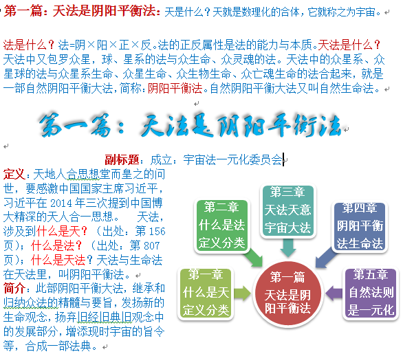 “天地人合自然大法”是一部天法。大法中的地法,是指地球的生命原理及生命结构。大法中的人法,是指人的生命原理及生命结构,大法中的众事物法,是指众事物的生命原理及结构。大法中的全法,是一个宇宙的生命原理及生命结构。大法中的修正与批判的法,是指众生命与众生物中的反生命原理与反生命结构。以及反生命能力。