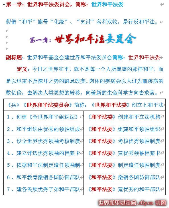 《世界和平法委员会》之重任是制定:全世界和平组织法,出处: