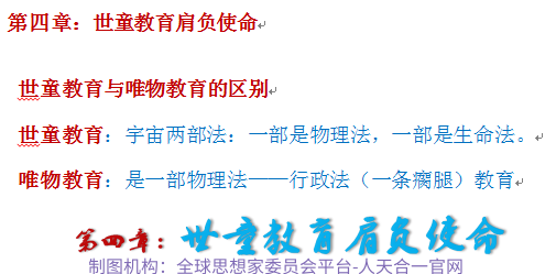 《世界儿童教育天学》的教材是物理法+生命法=宇宙的全法教育。人体的生命法是天地人合,天地人合是人体的最高生命法,天地人合法是引导人通法与入法的桥梁。战争的根就是唯物主义的偏执教育。
