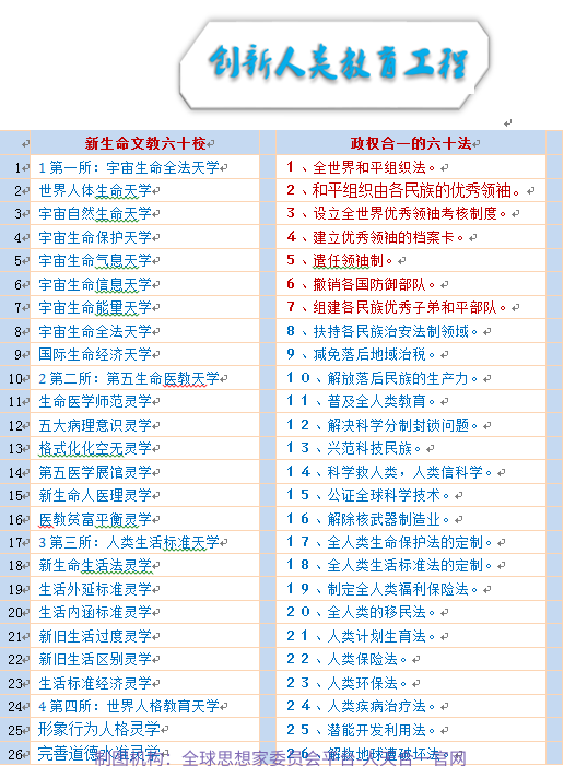 大学改天学;学院改灵学;高中改地学;初中改人学;小学改合学;幼儿园改法学;创新人类教育工程•60+60+10大学中国儿童教育天学