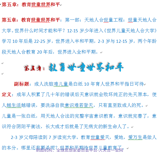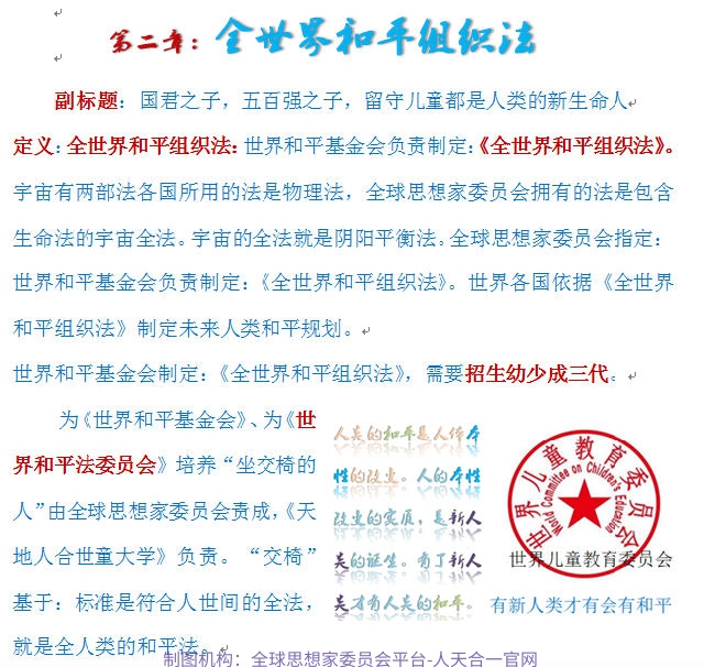 人类要组建《世界和平法委员会》依据世界和平基金会的10-20年的规划,由《世界儿童教育天学》招生培育。