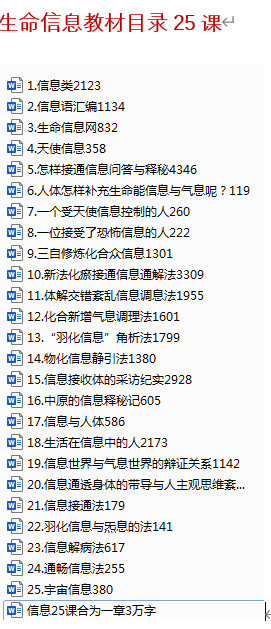 宇宙信息的密码号相对于各天体信息。宇宙中的每一位天体都有一个密码号。人的身体里的密码也是10个数,10个数是0123456789。人体里的密码可以调整,调整后的密码号对准哪一位星球的信息号码,人体就可报出哪一个星球上的事物。