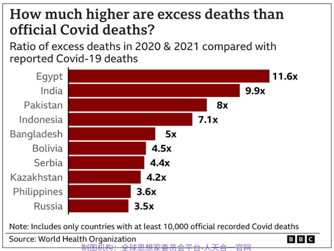 报告指出,大多数“超额死亡”(84%)集中在包括印度在内的南亚和东南亚、欧洲和美洲国家;约68%的“超额死亡”集中在10个国家中。其中,印度“超额死亡”人数约为官方统计的10倍,高达470万,几乎占全球死亡人数的三分之一。