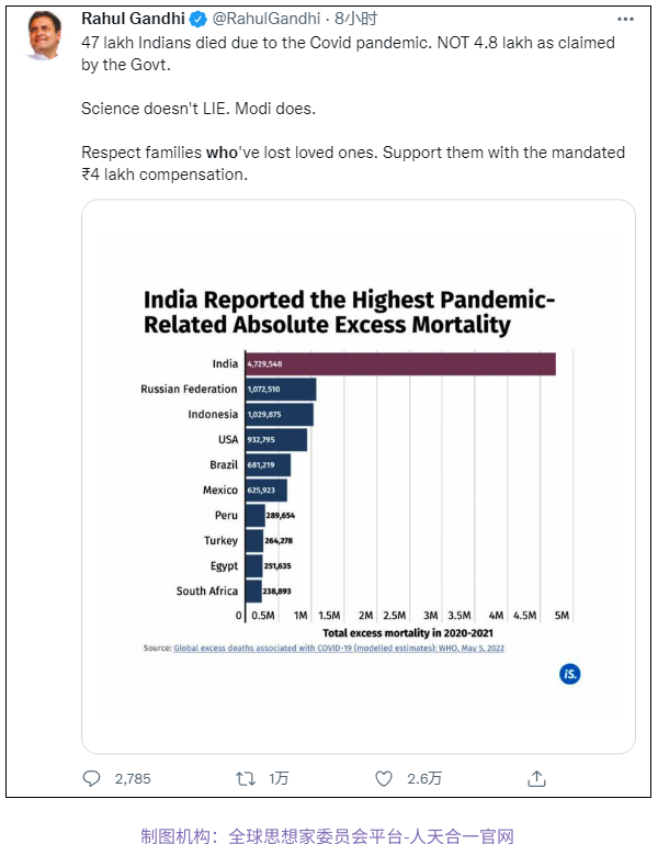 5月6日,印度国大党前主席、现国民议会议员拉胡尔·甘地6日在推特发文称:“470万印度人死于新冠病毒疫情,不是政府声称的48万。科学不会说谎,但莫迪会。”他还呼吁莫迪政府对新冠死者进行赔偿。