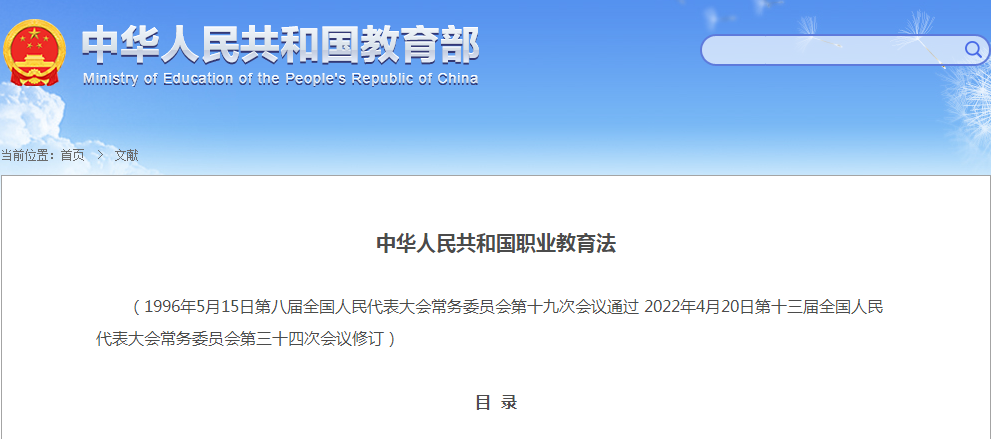 2022年4月20日,十三届全国人大常委会通过了新修订的《中华人民共和国职业教育法》,并于5月1日起正式实施。据了解,这是该法自1996年颁布26年以来首次进行大修。