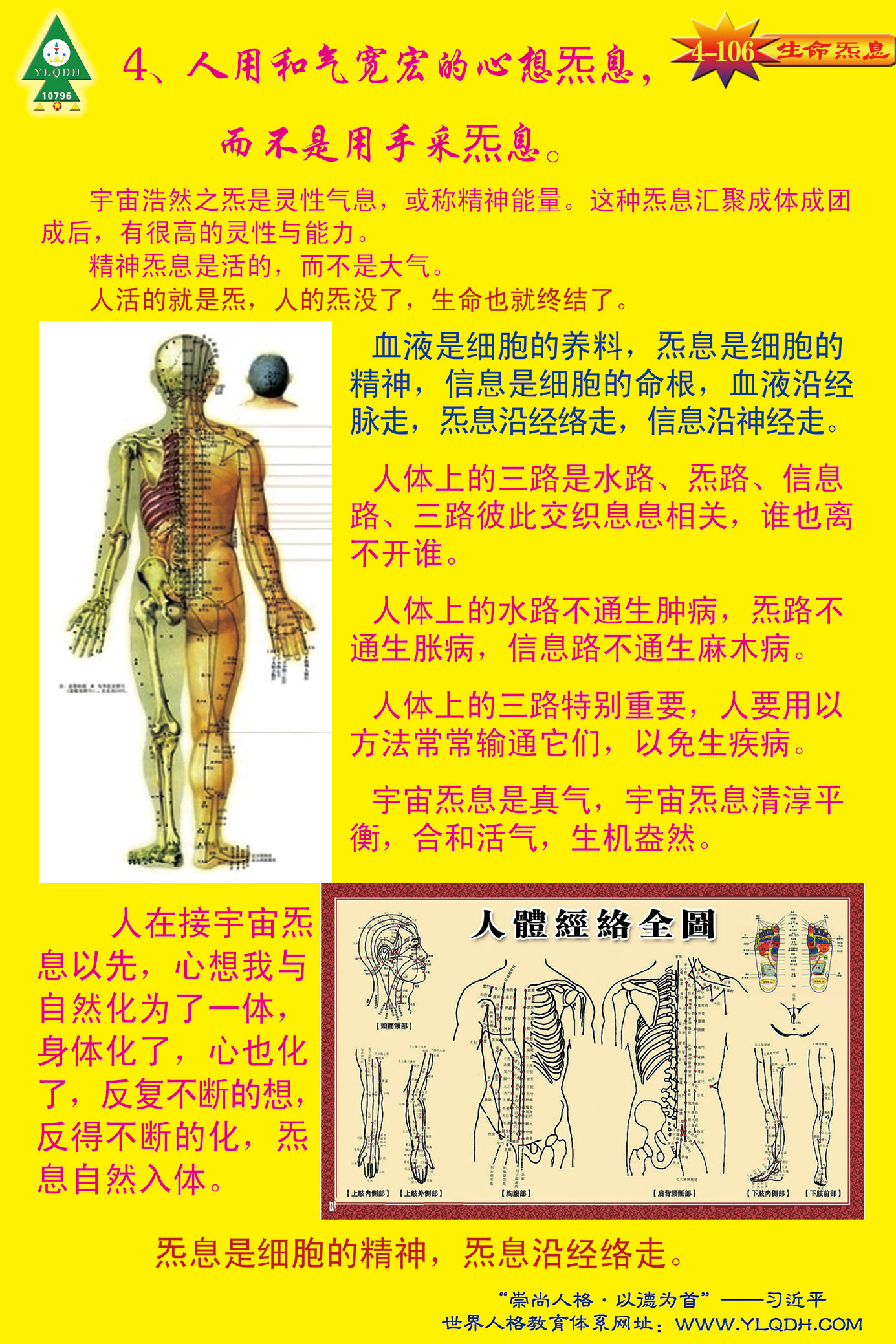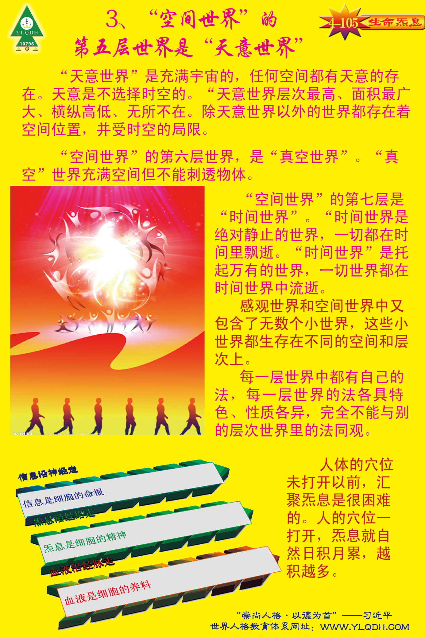 人体与宇宙生命连通就会充满能量、智慧、活力、知识、生机,人体的愚昧,疾病都会消失。