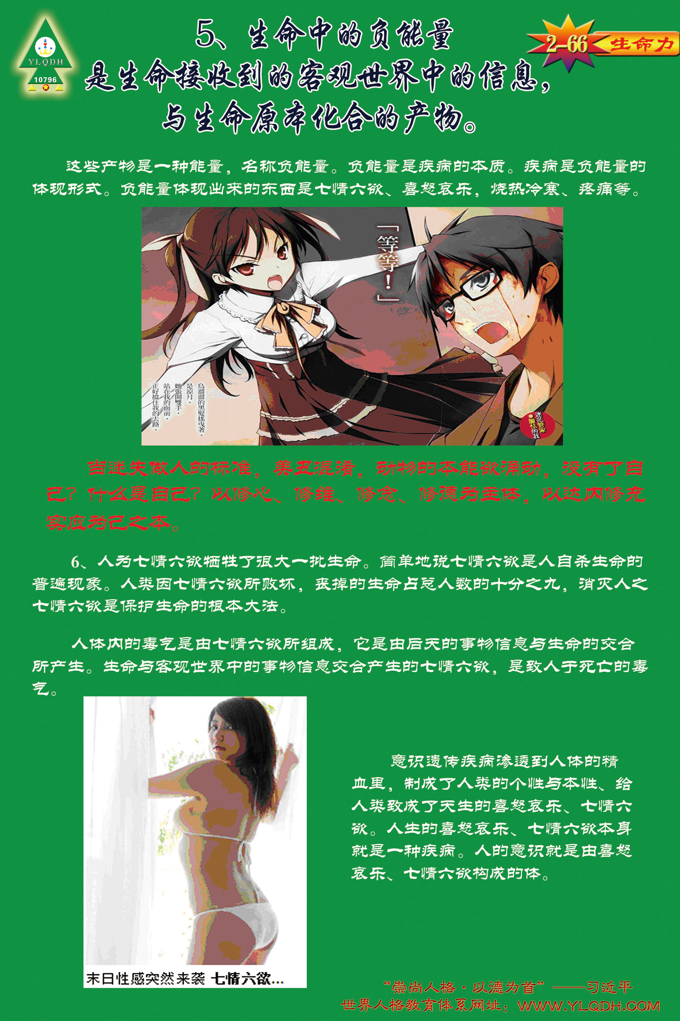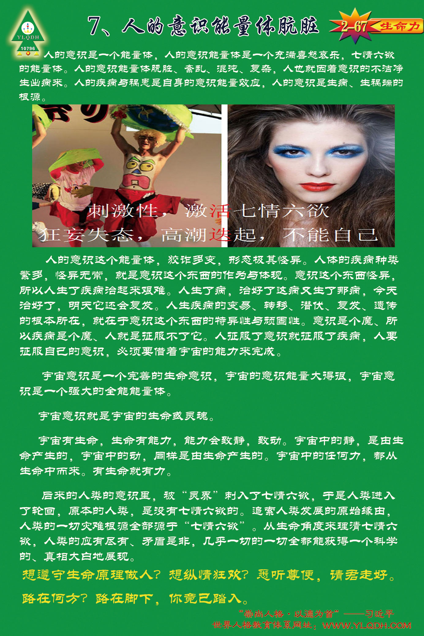 【4、生命展馆的目标,今日人生目标是把钱、性、权、毁、愚,做大、做强、做盛。生命展馆的目标是,为发展天地人合事业把钱做大;为获得生命能量把性做弱;为调平阴阳让权通正直;为遵循潜能新宇宙法发展天地人合;与天地合一空静真无,无中生有,生大智慧。渴爱合之新,弃二分之旧,死掉自我,反能身心健康长寿。