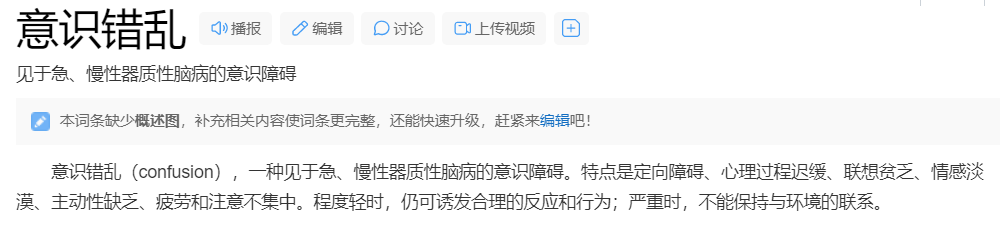 意识错乱是一种较严重的意识障碍,表现为患者定向力和自知力均差,有大量的幻觉和妄想,但不系统、无逻辑性。