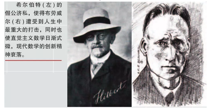 希尔伯特(1862~1943)是20世纪初最著名的德国数学家,他因为发明和发展了大量的思想观念(例如:不变量理论、公理化几何、希尔伯特空间)而被尊为伟大的数学家。布劳威尔(1881~1966)则是一位比希尔伯特小近20岁的荷兰数学家,在拓扑学领域有着突出贡献,他强调数学直觉,被视为直觉主义的创始人和代表人物。