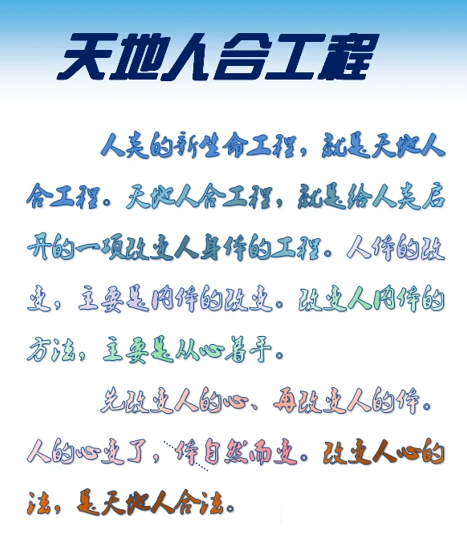 人类的新生命工程,就是天地人合工程。天地人合工程,就是给人类启开的一项改变人身体的工程。人体的改变,主要是内体的改变。改变人内体的方法,主要是从心着手。先改变人的心、再改变人的体。人的心变了,体自然而变。改变人心的法,是天地人合法。天地人合法从人心着手,直达到改变人的体。人体的改变,就会导致世界的改变。新人体的出现,也就是新世界的诞生。