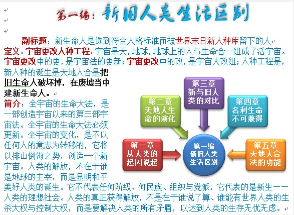 第一编:新旧人类生活区别:旧人类的生活,是唐宋元明清,帝王将相,旧人类就是今天的社会结构,依然延续旧制所遗留下来的,分封划界设政制权。分封制属于奴隶制与封建制的演变。新人是,新生命人,新生命-新生命的标准是真善美。