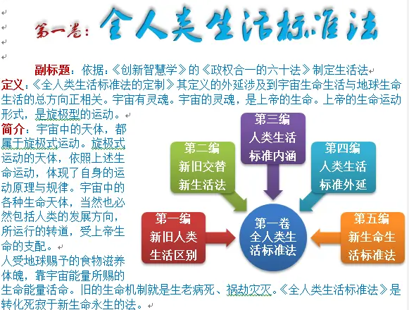 第一卷:全人类生活标准法:全人类生活标准法的定制是出自,天地人合法【951】页。《(一百○九)政权合一的六十法》第18、《全人类生活标准法的定制》。什么是生活?生活是生命的本性,依据《旋极运动的宇宙灵魂》制定全人类生活标准法。