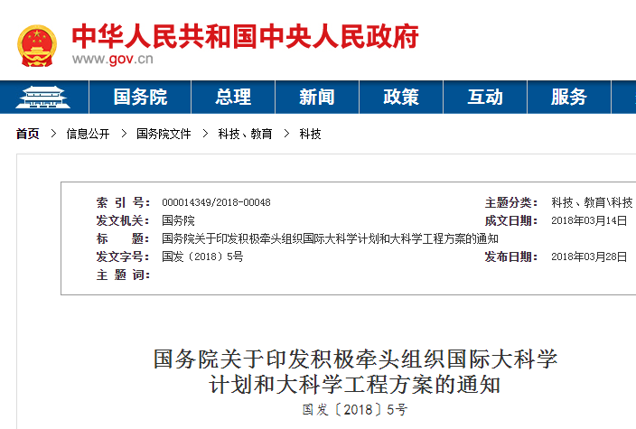 《国务院关于印发积极牵头组织国际大科学计划和大科学工程方案的通知》
