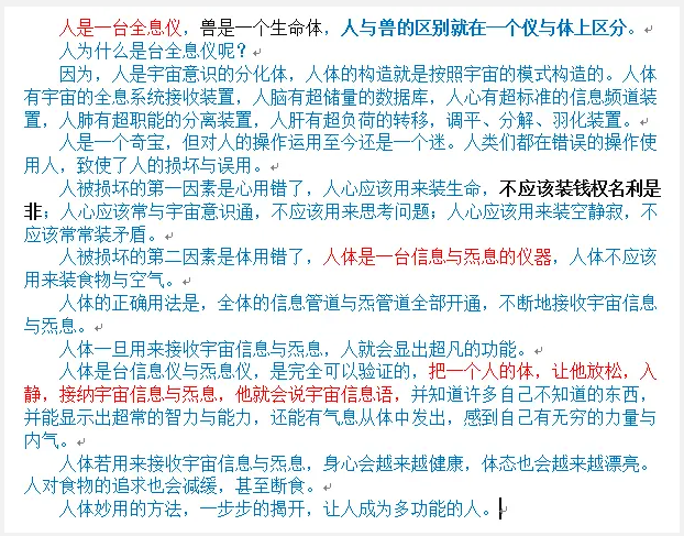人体是台信息仪与炁息仪,是完全可以验证的,把一个人的体,让他放松,入静,接纳宇宙信息与炁息,他就会说宇宙信息语,并知道许多自己不知道的东西,并能显示出超常的智力与能力,还能有气息从体中发出,感到自己有无穷的力量与内气。