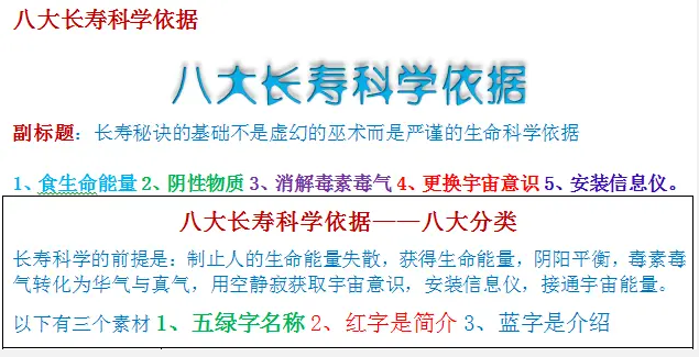 长寿科学的前提是:制止人的生命能量失散,获得生命能量,阴阳平衡,毒素毒气转化为华气与真气,用空静寂获取宇宙意识,安装信息仪,接通宇宙能量。