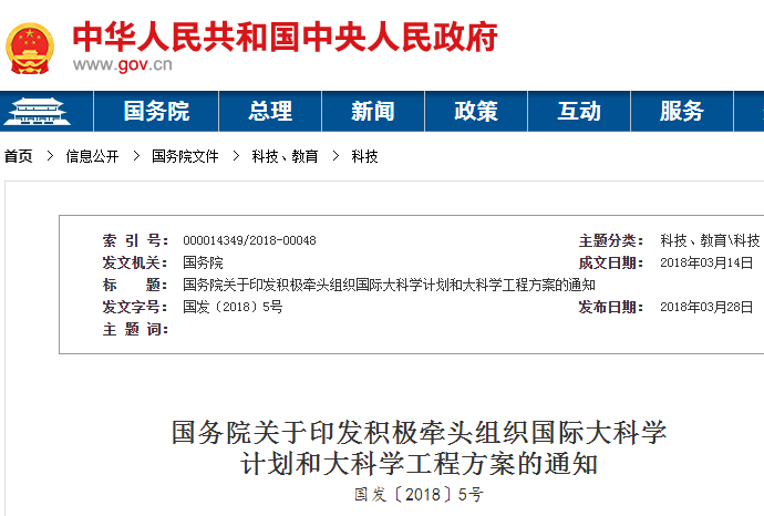 国务院关于印发积极牵头组织国际大科学计划和大科学工程方案的通知