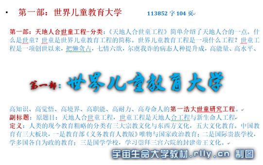 人天合一工程下设立了,宇宙生命全法大学,宇宙生命全法大学的年龄分类中的儿童生命教育院系里,设定了世界儿童教育委员会,该委员会中设定的世界儿童教育大学。