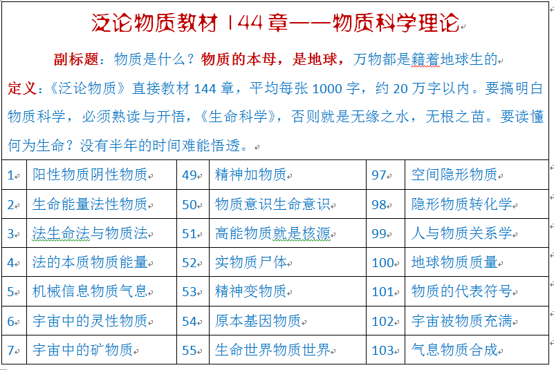 第一卷:世界教育管理机构,简称:世教管理。简述:人类的教育应由两个部分构成,一部分是生命教育,一部分是物质教育。人类的生命教育教材,应以全新的时代宇宙意识来写。生命教材按阳性面是物质教育部分,就是按生物体中的筋骨教育。对生命教育与物质教育不通的人类,已施教万载。这就是世界教育管理机构的使命。
