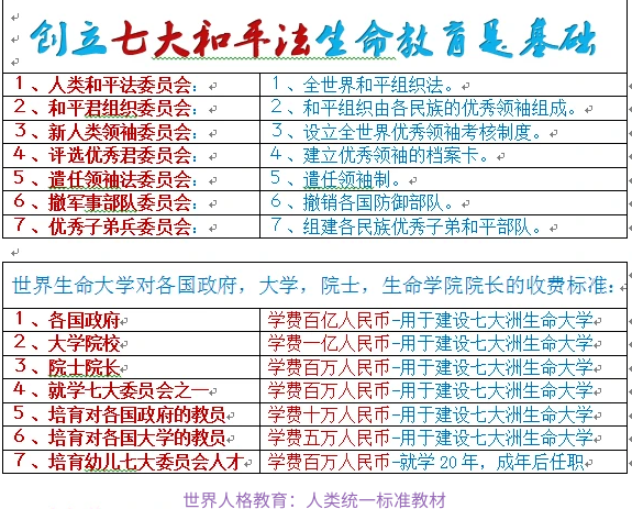 总则:换种机构简述解析:依据宇宙主宰要用新生命更换人种与中央提出的素质教育而制定世界教育法,用基因教育换种机构来执行更换百万人种计划。在中国创建妊前基因学院,本学院通过用妊前基因教育孕育方法培育100万新生命人种。播种人与受孕人是选拔优秀的应届男女毕业生各百万人进行妊前基因教育。